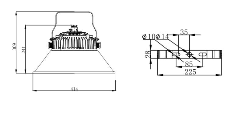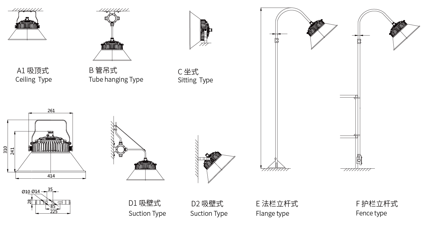 安裝方式:可根據需求采用吸頂、吸壁、彎桿等多種安裝方式,滿足低頂、平臺、高頂、高棚等多種場所作為固定照明使用,產品采用抗震材料和減震結構,尤其適合應用在各種高頻率、強震動場所。